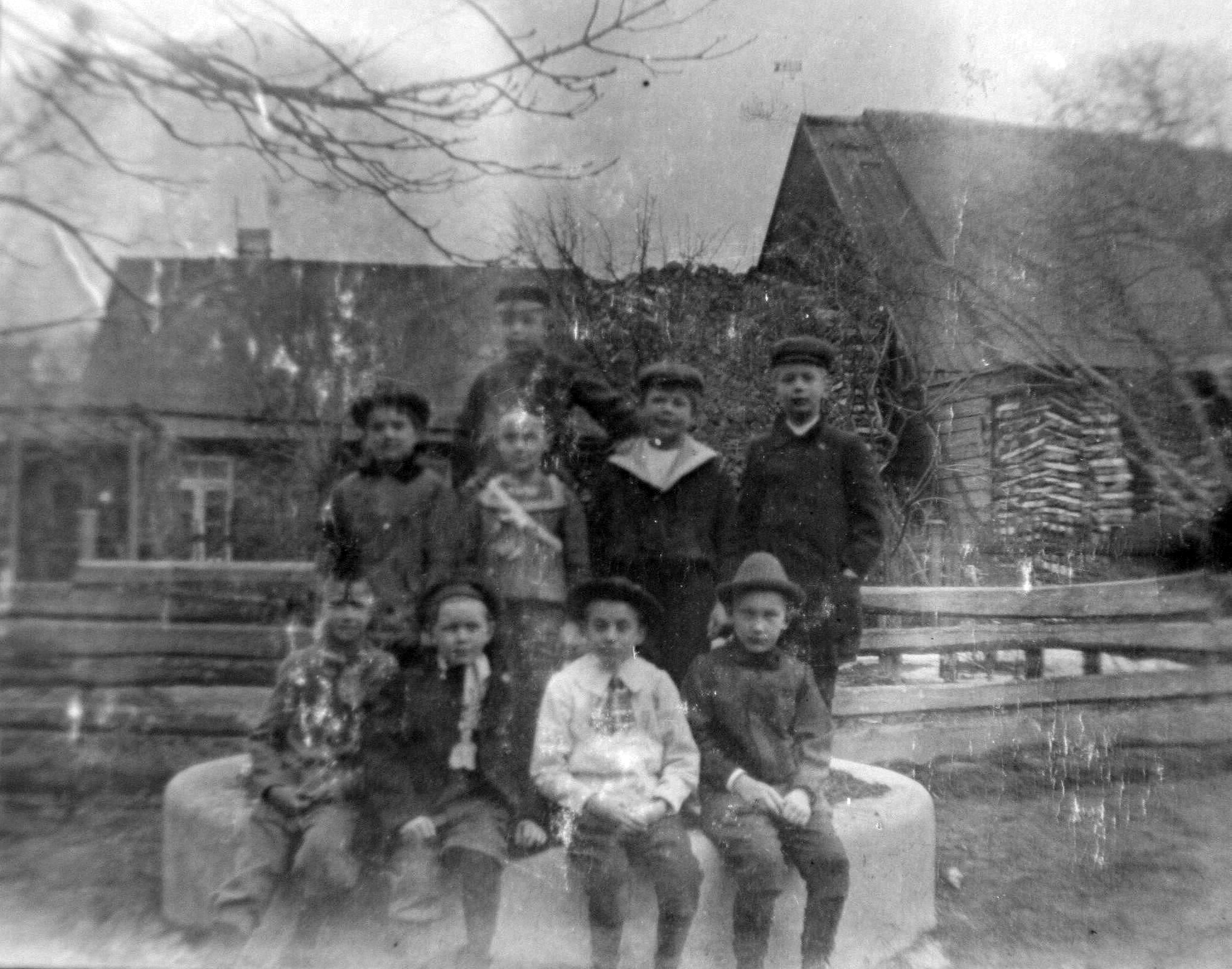 Комментарий Артура: Слева на право сидят: Прадедушка Абих Генрих-Яков (1846-1918) дядя Карл-1907-1987, бабушка – Катарина-Маргарета Биркгейм (1869-1941), дядя Агуст (1909-1982). Стоят: первый – неизвестный, потом мой отец Абих Якоб (1902-1970), потом предположительно тётя отца Амалия (1887 г.р.). Дальше стоит моя тётя Катарина-Маргарета (1900-1971) –) по мужу Думлер. Остальные, скорее всего, близкие родственники: сродные братья отца, живущие в доме номер 46.