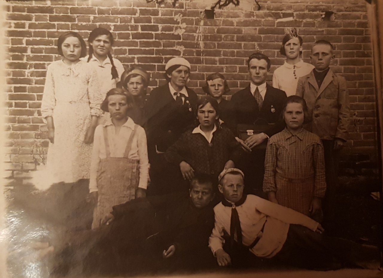 “In front of the school in the village of Grimm. I cannot say the exact date of the photograph. In the lower right corner, in a white shirt, is my grandfather, Reinhold Karlovich Wolf, born on 18 January 1928.”