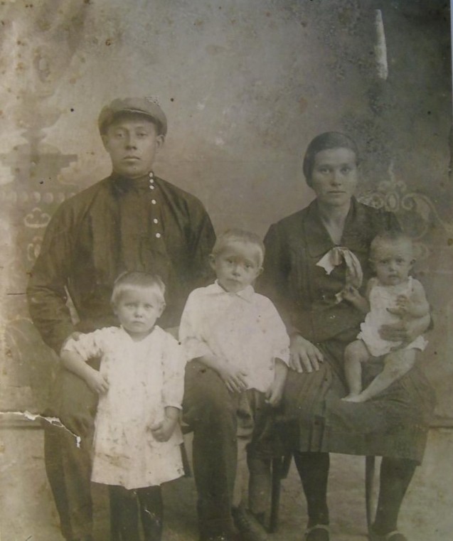 Friedrich Yakovlevich Seibel (1906–1934) and Anna Davydovna Meisner (1909–1988, Bashkiria, city of Oktyabrsky). The children in the photograph are Lidiya (married name Dummler), Roza (married name Gordeeva), and Alexander – the eldest child in the family, standing in the middle.